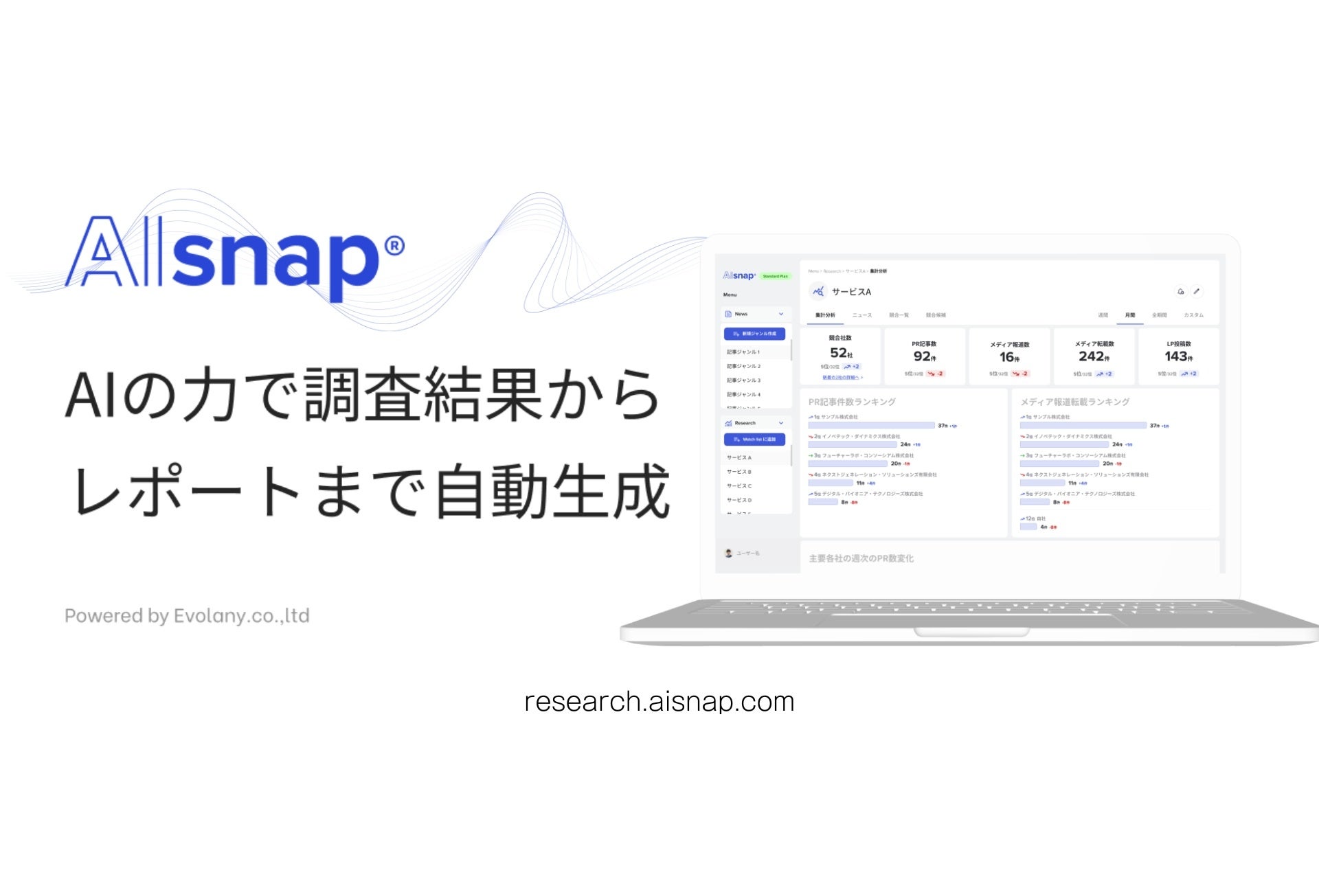 エボラニ株式会社は2024年3月21日、AIを活用した情報収集ツール「AIsnap (エーアイスナップ)」を発表しました。キーワードを入力するだけで競合他社のリストを自動で作成し、最新のプレスリリース配信やメディア掲載記事などを可視化します。