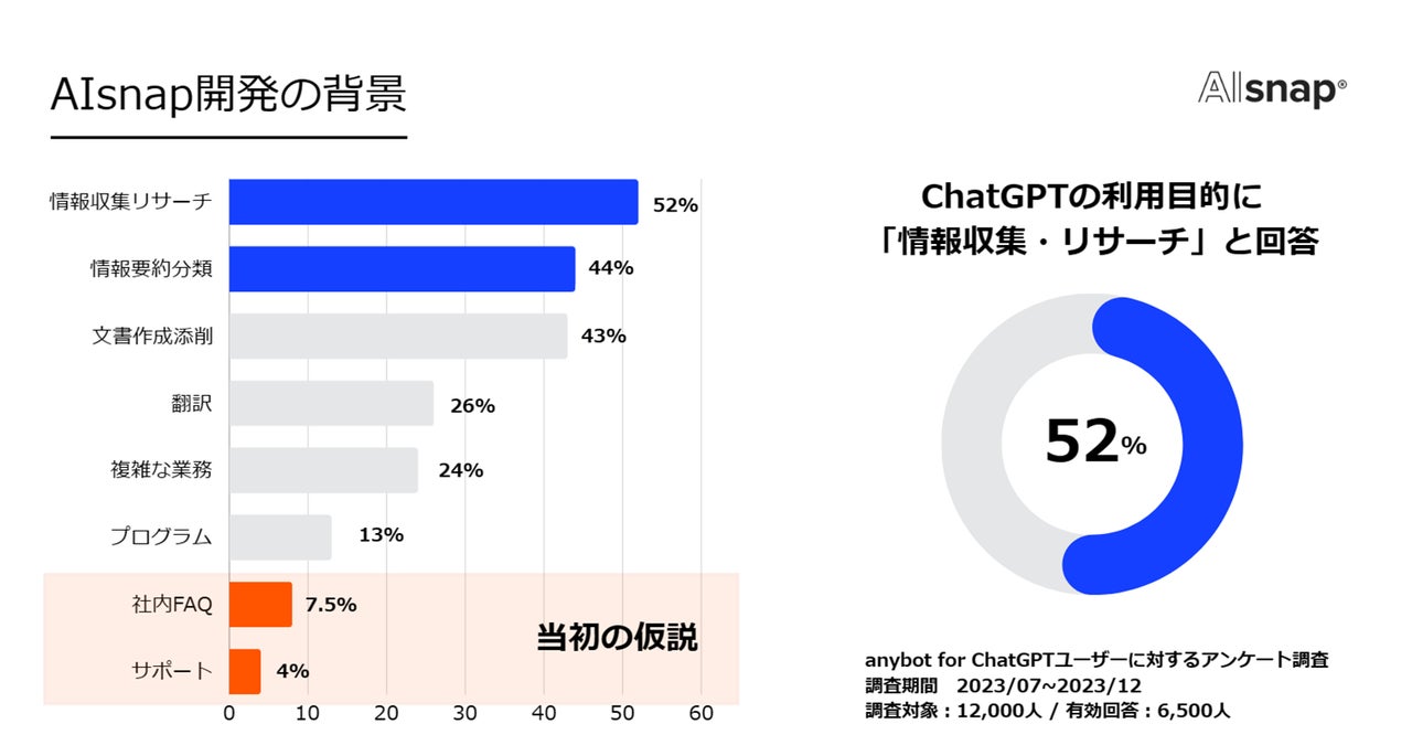 マーケティングツール「anybot for ChatGPT」を約1年運用して得た知見とユーザーへの調査を元に、ChatGPTの利用目的として最もニーズが高い「情報収集・リサーチ」に特化したツールを開発しました。