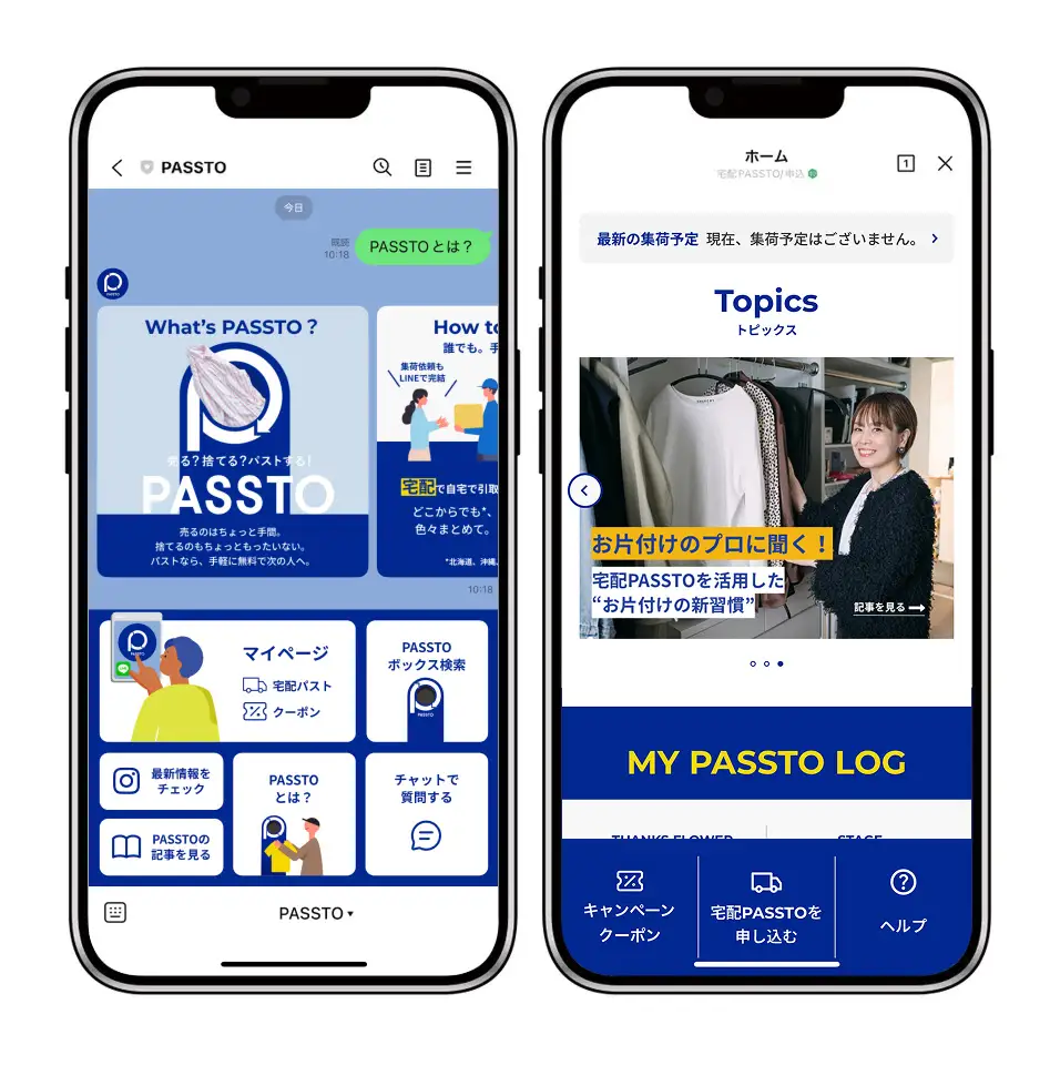 今年3月から、自宅から無料で不要品を手放せる「宅配PASSTO」のサービスを展開して参りましたが、このたび「PASSTO」のLINE公式アカウントおよびLINEミニアプリの提供を開始し、宅配PASSTOの申込みから集荷依頼までをLINE上で完結できるようになりました。生活者にとって「捨てない選択」がより簡単で身近なものになるよう、利便性の向上とともに、不要品をより楽しみながら手放せる仕掛けや、お得に手放せるキャンペーンなどの提供も進めていく予定です。これからも様々なパートナー様と連携しながら、暮らしにもっとも近い資源循環の入口としてPASSTOを広げていくことで、捨てない社会の実現を目指してまいります。